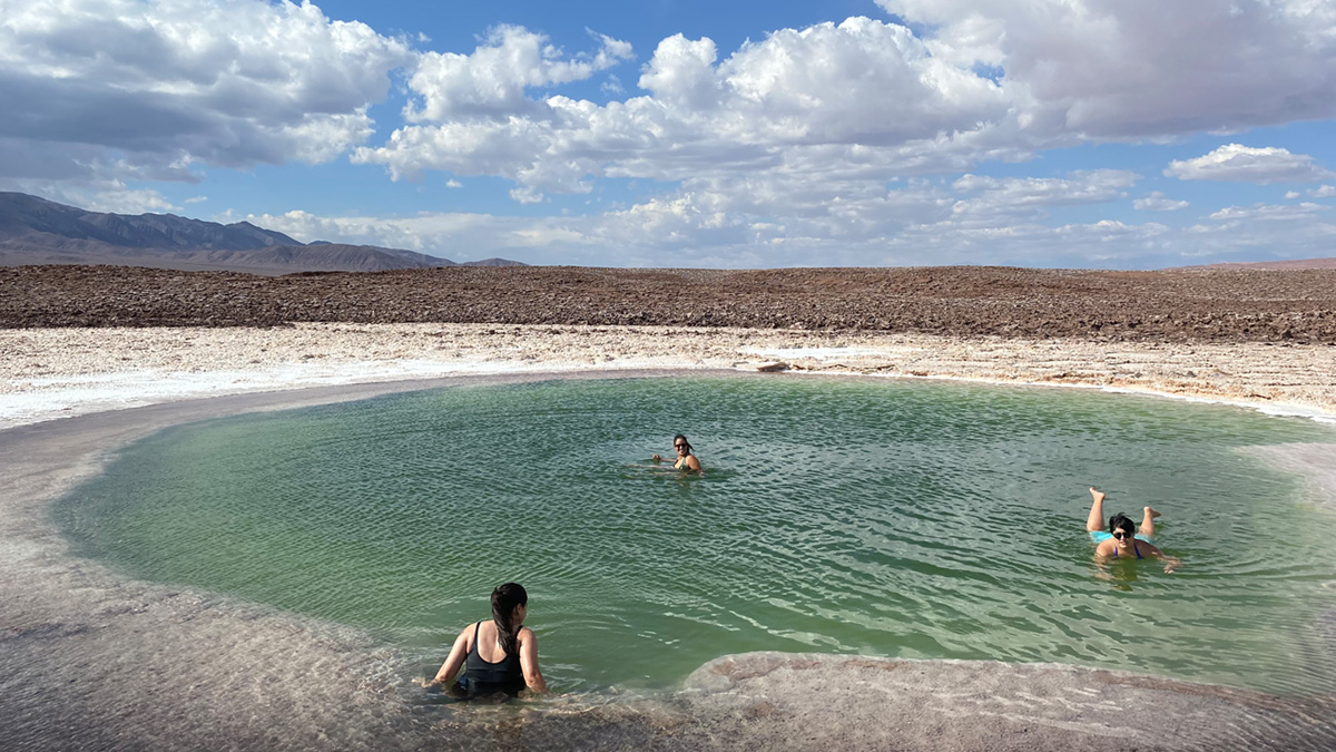 Nos dirigimos hacia el sur oeste por la carretera hacia Calama, a unos 10 km nos dirigimos hacia el sur por detrás de la cordillera de la sal y la cordillera de Domeiko, continuamos la ruta observando ambas cordilleras hasta llegar al km 50, allí nuestro destino las hermosas lagunas Baltinache o Escondidas, aquí podrán bañarse y flotar en sus aguas gracias a la gran concentración de sal lo cual las hace muy especial, podrás disfrutar de una experiencia relajante y única en pareja, la belleza y tranquilidad de estas lagunas crearan un recuerdo único en el desierto de atacama. El origen del salar se remota al cretácico, cuando el surgimiento de la cordillera de los Andes atrapo brazos marinos que se desecaron debido a la evaporación y las escasas precipitaciones.